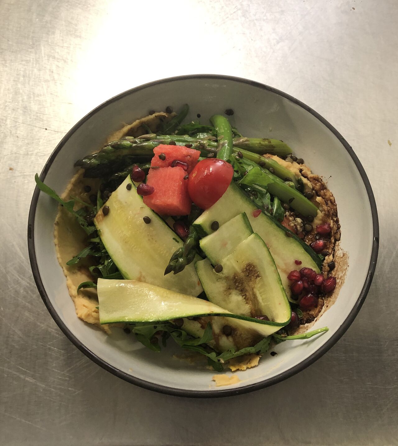 The menu is simple and relies on all the current food trends listing veggie bowls with quinoa , different quiches , avocado on sourdough, warm goat cheese with sweet potato on summer salads , and pulled pork sandwich with cole slaw, plus some specials like a beef tagliata and grilled salmon with lemon grass butter, and a range of daily lunch dishes.